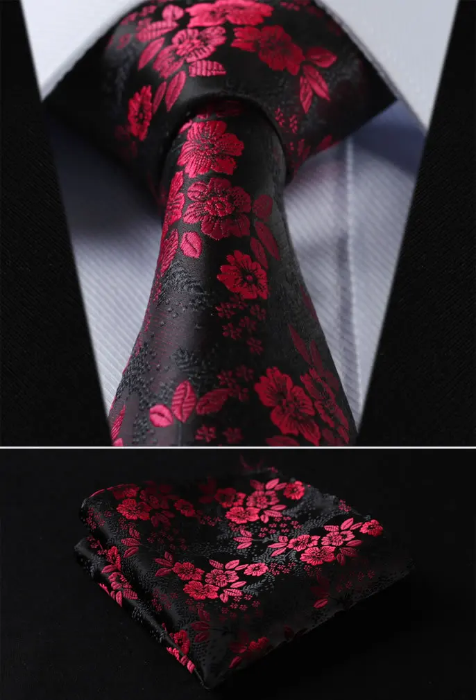 OVERVIEW Product TF2005R18 Red Black Floral 3.4" 100%Silk Wedding Jacquard Woven Men Tie Necktie Pocket Square Handk